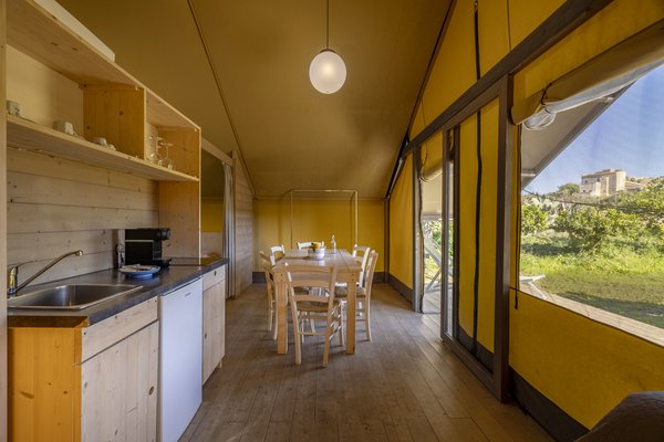 Glamping accommodations are fir wood structures measuring approximately 50 square meters in total, with a 16 square meter covered veranda that allows you to enjoy blissful moments of relaxation while contemplating the greenery of the Trapani countryside or sipping a glass of wine from our selection. Furnished with custom-built wooden furniture with a simple, linear design, they are perfect for a family vacation or with friends with a touch of adventure. Internal and external wall coverings are made of fireproof cotton. The units are equipped with bathrooms with ceramic sinks and toilets, an 80x120 cm shower, and a 50-liter storage boiler.